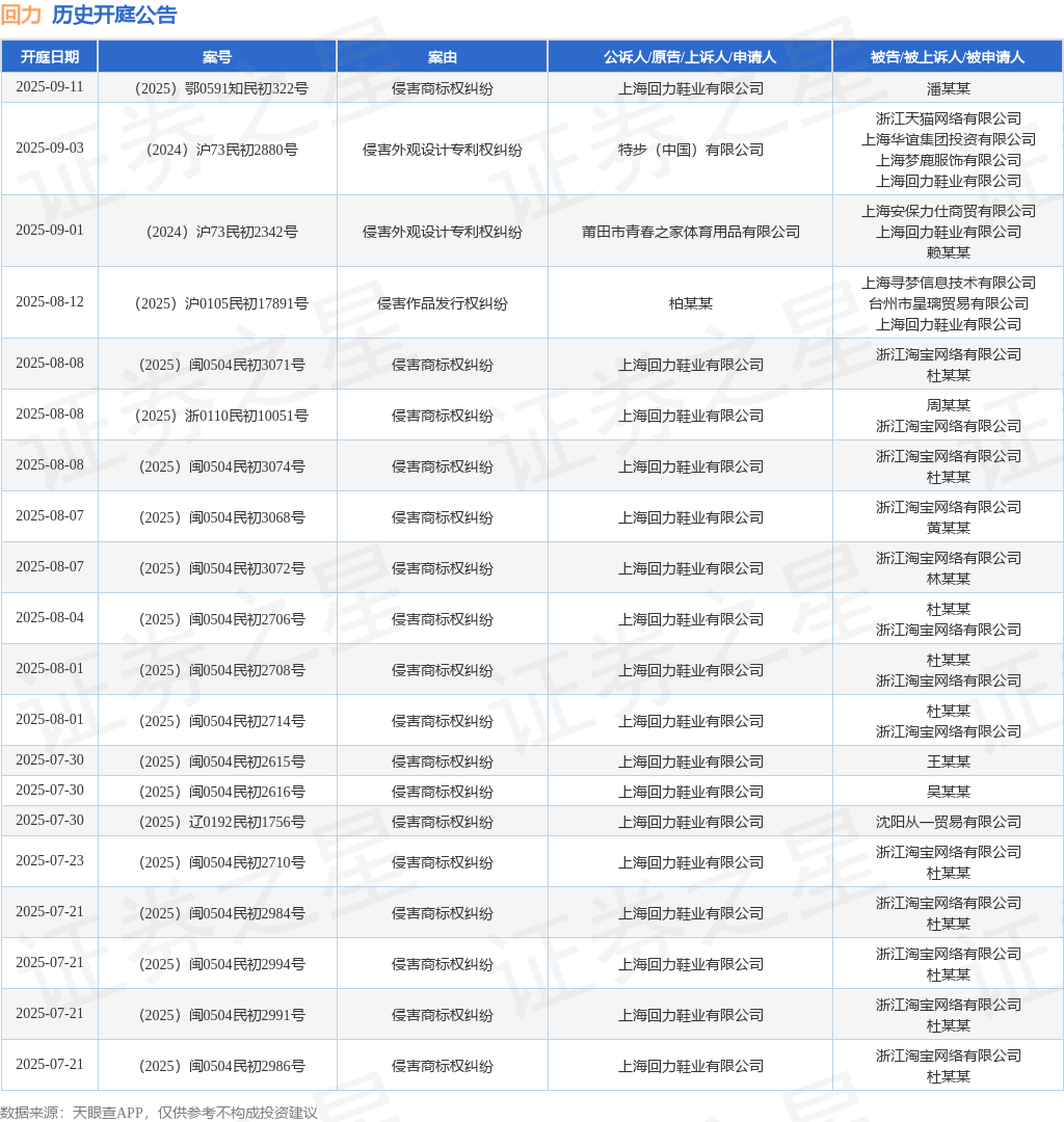 本站消息,根据天眼查APP显示,近日公布了一则上海回力鞋业有限公司作为被告/被上诉人的开庭公告,详细内容如下: